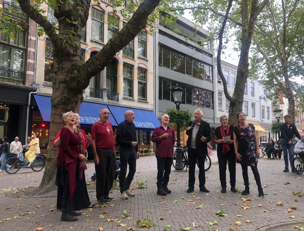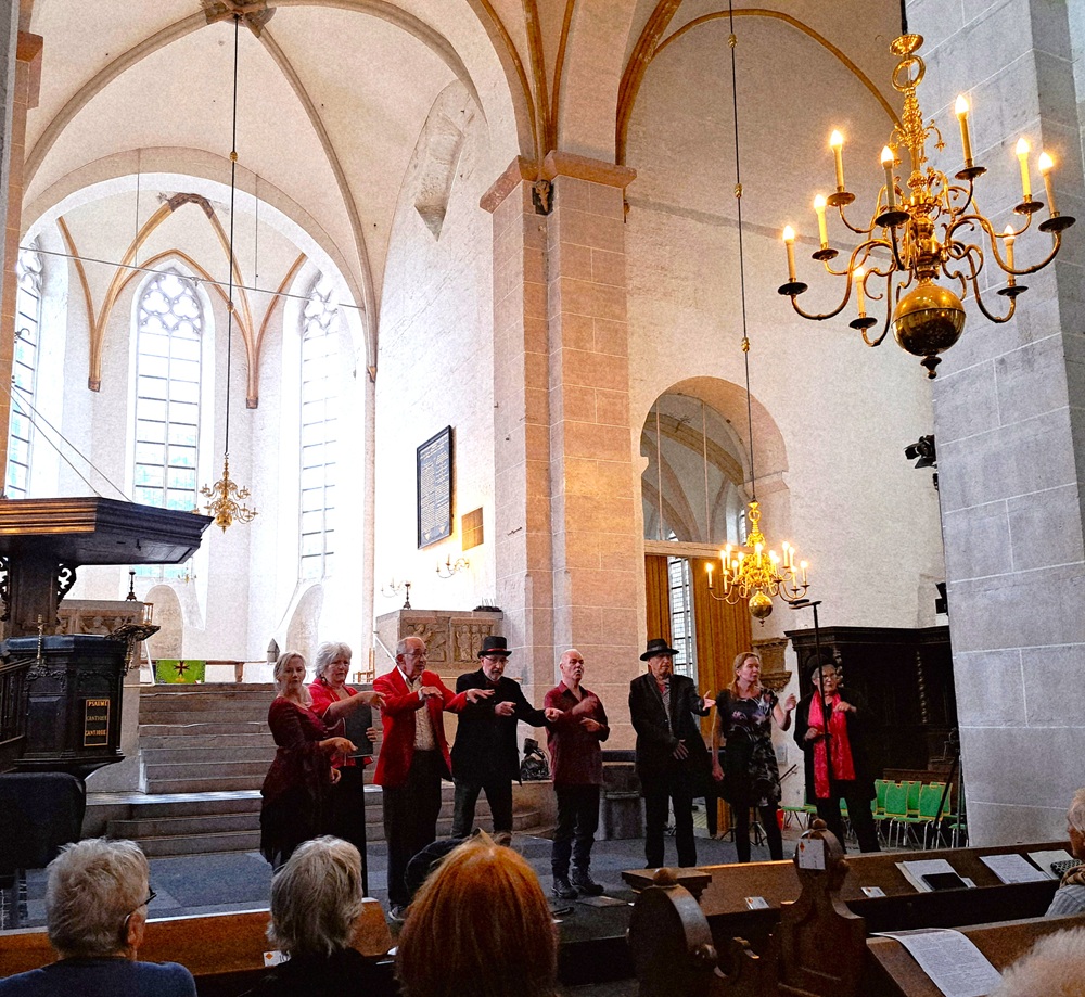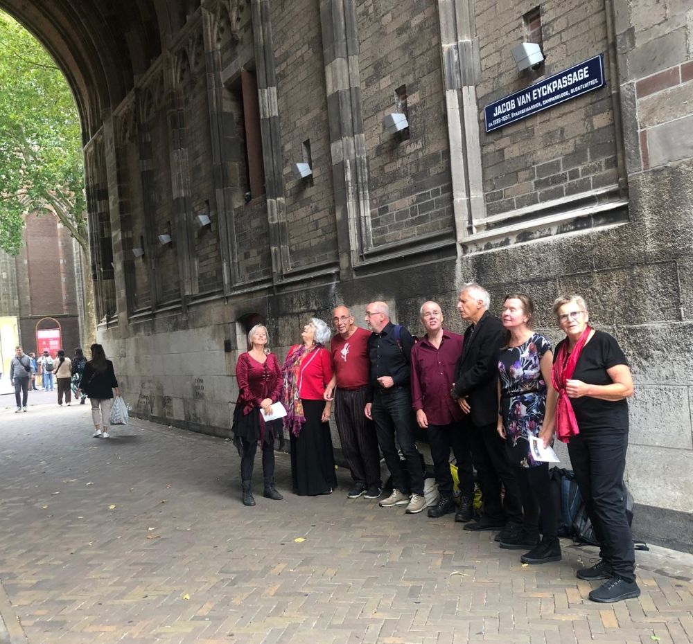 We hadden de eer en het genoegen om op te treden tijdens (niet in) het Festival Oude Muziek in Utrecht. Op 3 september 2025 zongen we in de beroemde Pieterskerk in Utrecht een programma met alleen oude muziek, madrigalen en oud-Hollandse liederen, maar natuurlijk wel onze eigen versies. Om nog wat publiek te trekken, liepen we eerst een uurtje door de stad om liedjes te zingen en flyers uit te delen.